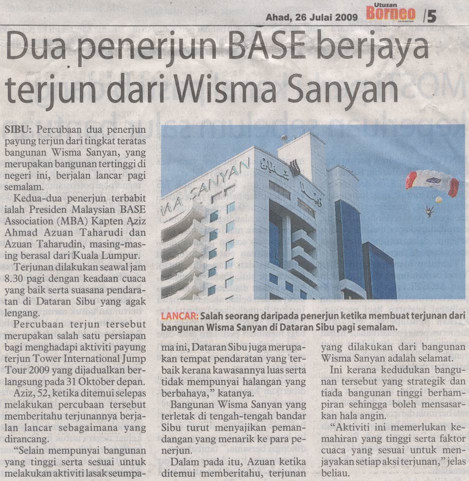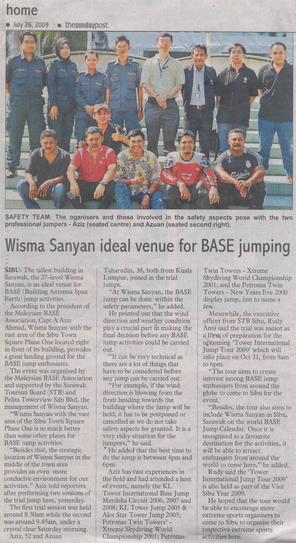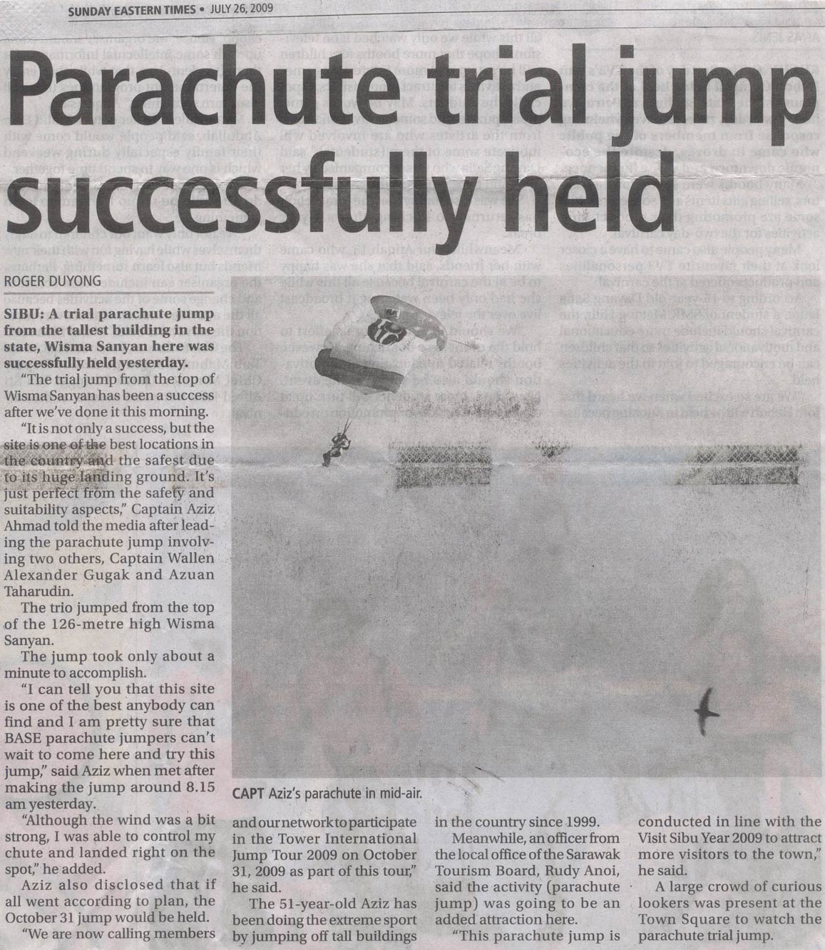 Trial jumps off Wisma Sanyan in Sibu took place on 25/07/2009. Jumps were completed by Malaysian BASE Association President, Captain Aziz Ahmad along with Azaun Taharudin.